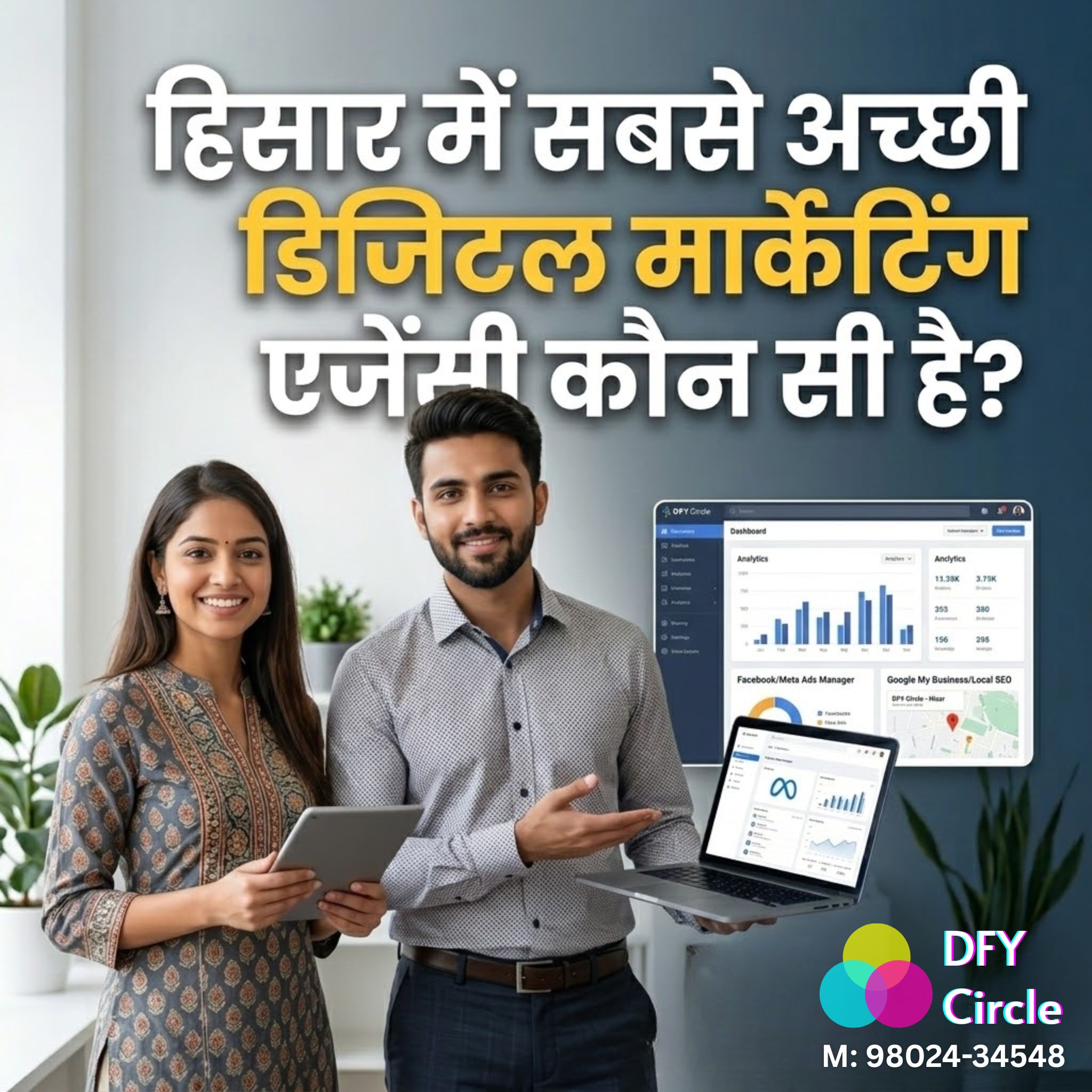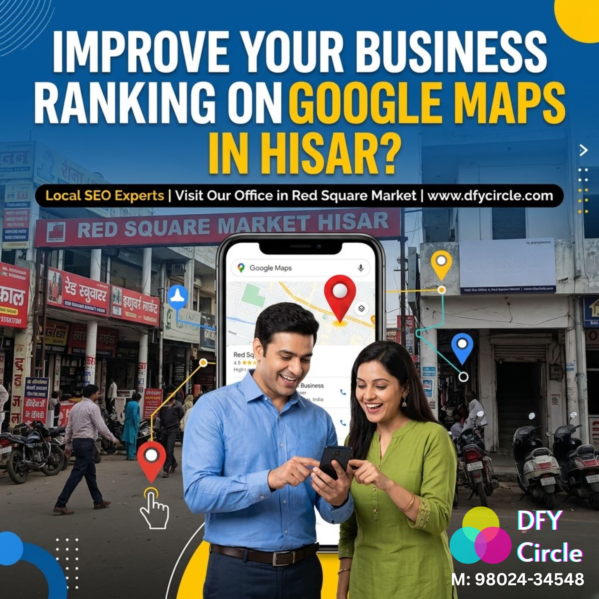 Our expert SEO services at DFY Circle focus on local search optimization. Visit our office in Red Square Market to see how we help Hisar businesses dominate "near me" searches.
