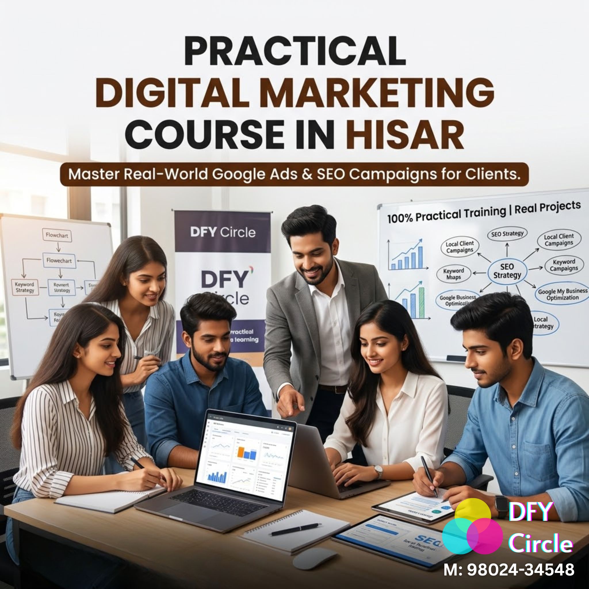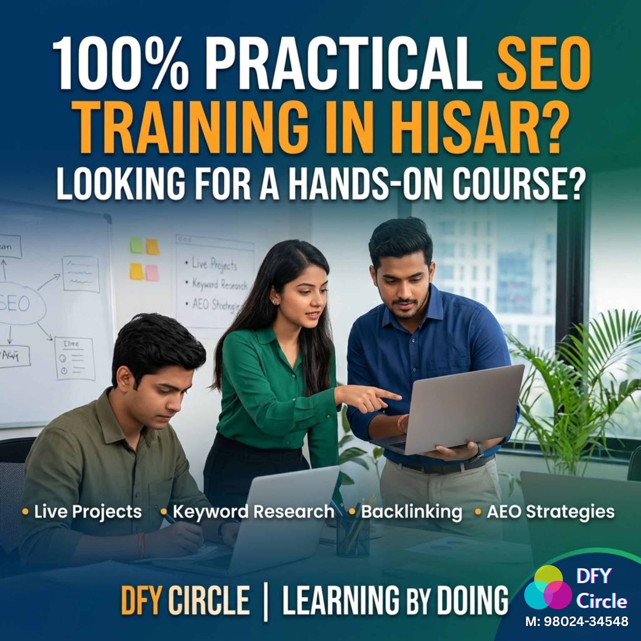 DFY Circle in Hisar offers a hands-on SEO course. Students learn keyword research, backlinking, and AEO strategies on live projects.
