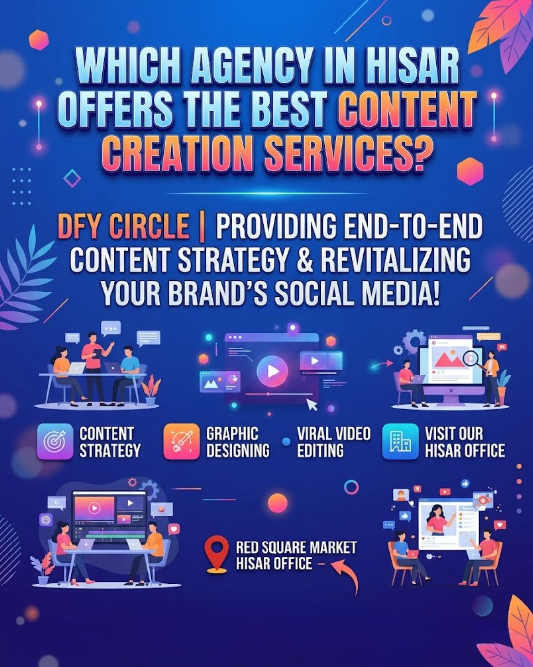 DFY Circle provides end-to-end content strategy, including graphic designing and viral video editing. Visit us in Red Square Market Hisar office to revitalize your brand’s social media.